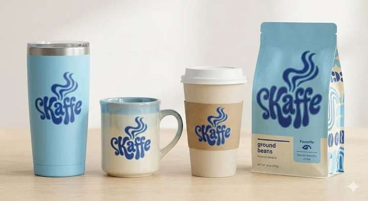 提示词:使用与上方标志相同的视觉风格和配色方案生成产品模型。制作哑光咖啡杯、陶瓷咖啡杯、带盖外带纸质咖啡杯和品牌咖啡豆包装袋的高质量图片,每款产品都应采用相同的复古、时髦的图形美学和流畅的双色字体。保持展示简洁、现代,并与标志轻松活泼的 60、70 年代风格保持一致,使用柔和的光线、简单的背景和统一的布局,使之看起来像是同一系列产品的一部分。