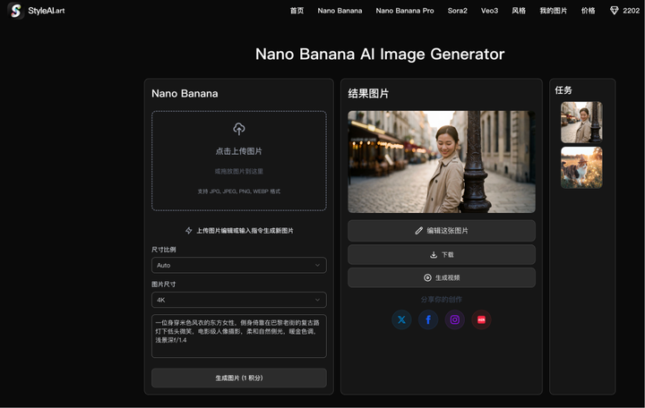 如果你不会科学上网,那你可以通过StyleAI官方网站(https://styleai.art/zh/nano-banana-pro)体验Nano Banana pro模型,StyleAi是Ai绘画视频工具,内含Nano Banana、Nano Banana Pro、GPT-4o、Sora 2、Veo 3.1、Veo3.0模型。每天免费3次,月90次随便造,国内直连秒出图!