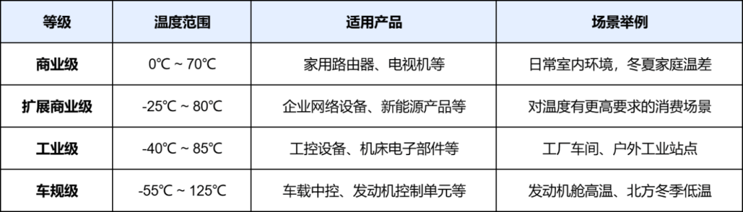 产品的使用场景千差万别,对高低温的耐受要求也各不相同。行业内根据产品的“温度适应范围”,大致可将其分为商业级、扩展商业级、工业级、车规级等,每个等级对应的高低温试验标准也截然不同。我们通过一张图片直观的对比一下。