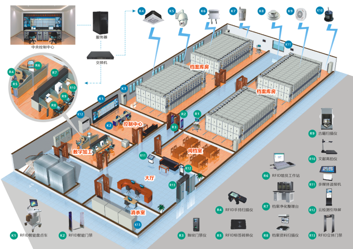1. 监测点布置:库房内需设置多个监测点,覆盖库房四角、中部、档案架密集区、靠近门窗及设备出风口等关键位置,确保监测数据全面反映库房整体环境(面积超过 50㎡的库房,监测点数量不少于 3 个);