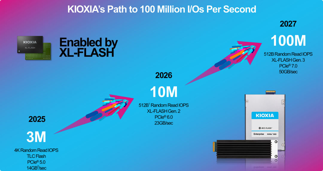 - 洞察高性能存储介质与接口演进:认识KIOXIA XL-FLASH等低延迟NAND技术和PCIe 5.0到7.0的演进,及其对实现1亿IOPS超高存储性能的决定性作用。