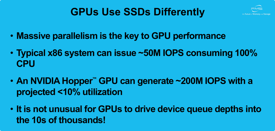 - I/O模式不同: GPU的海量并行特性,使其会产生 “数万”级别(Tens of thousands) 的超深I/O队列深度(Queue Depth)。