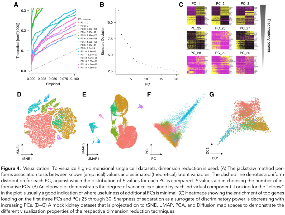 在这一章中,作者提到了使用 PCA 降维,并用 t-SNE 和 UMAP 算法进行可视化。聚类的话,目前Louvain 和 Leiden 最两种最流行的方法。