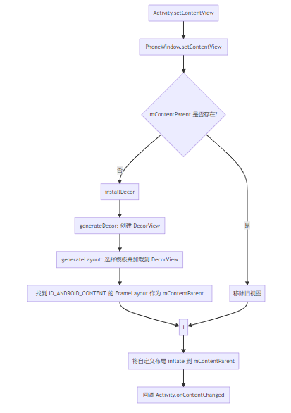 mContentParent 是 ViewGroup 类型,它是我们自定义布局的直接父容器。mContentParent 为空,说明是第一次调用 setContentView,需要调用 installDecor() 来创建整个窗口的视图结构。LayoutInflater.inflate() 将我们的布局文件解析成 View 对象树,并添加到 mContentParent 中。Callback(也就是 Activity)的 onContentChanged() 方法通知 Activity。这是构建窗口根视图结构的地方。