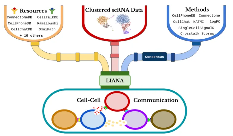 单细胞RNA测序的快速发展激发了人们对细胞间通讯机制的研究兴趣。近年来,已有多种用于研究细胞—细胞通讯(CCC)的工具和数据库被相继开发。然而,这些方法通常是固定绑定的——每种分析工具往往只能与特定的资源配套使用——尽管从原理上讲,任何计算方法都可以与任意配体–受体数据库组合使用。为了解决这一限制,研究团队开发了liana框架,旨在将分析方法与资源解耦,从而实现灵活组合与扩展。