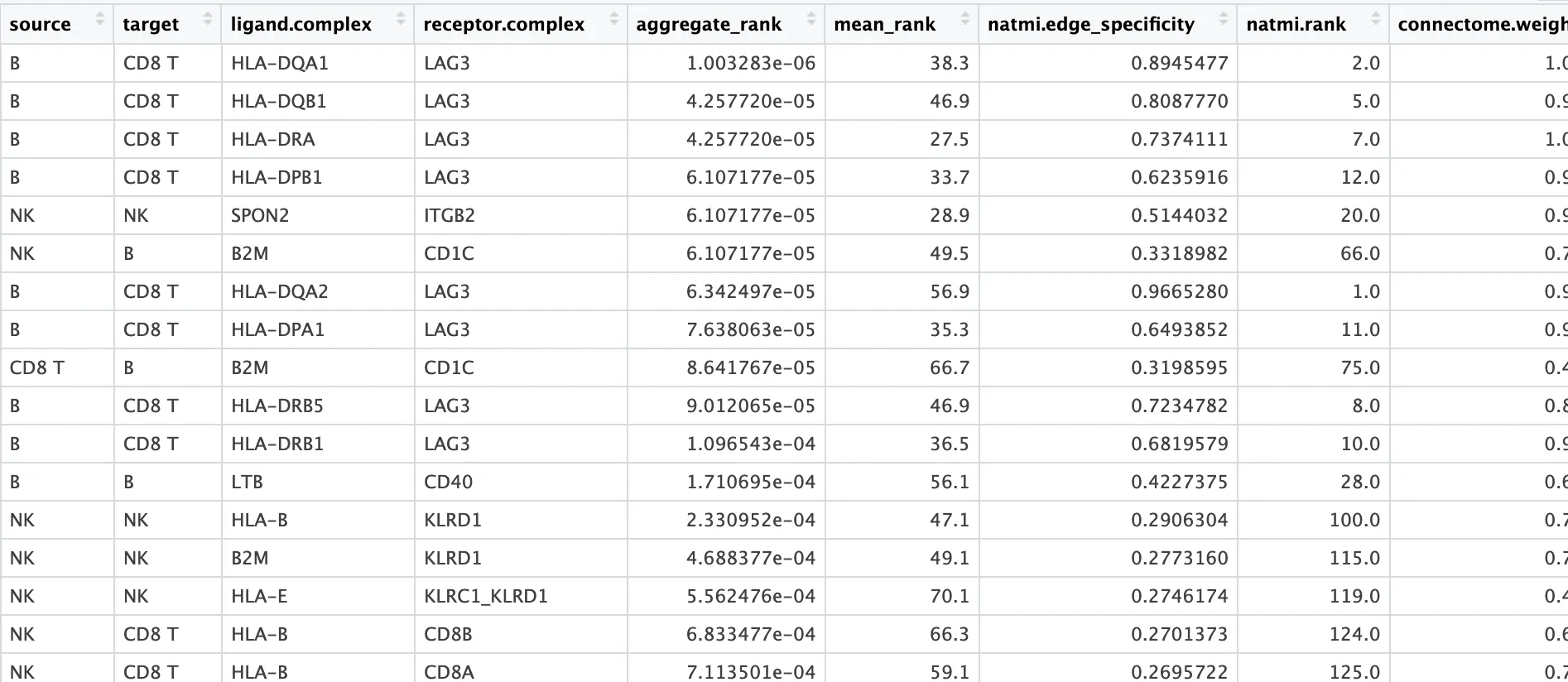 # $ receptor.complex <chr> "LAG3", "LAG3", "LAG3", "LAG3", "ITGB2", "CD1C", "LAG3", "LAG3", "…