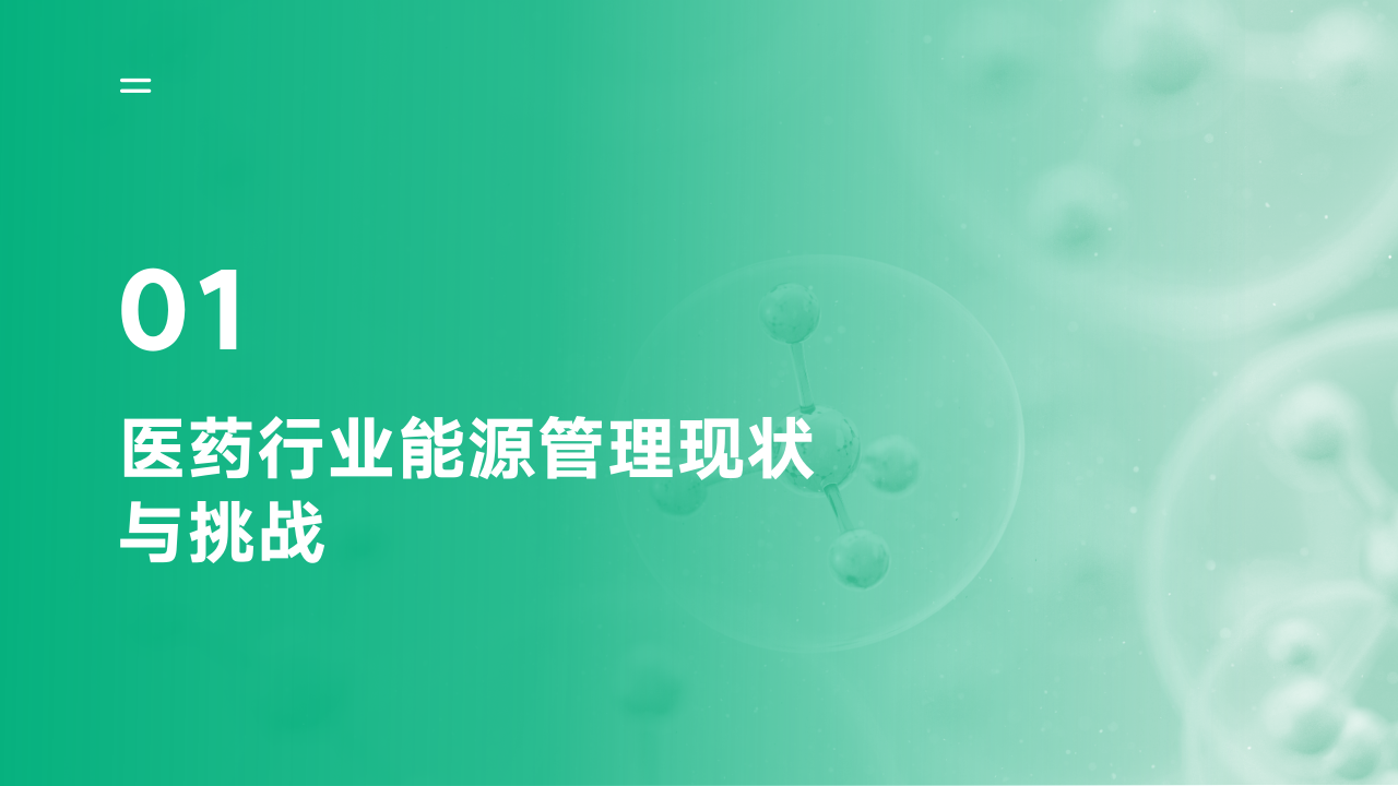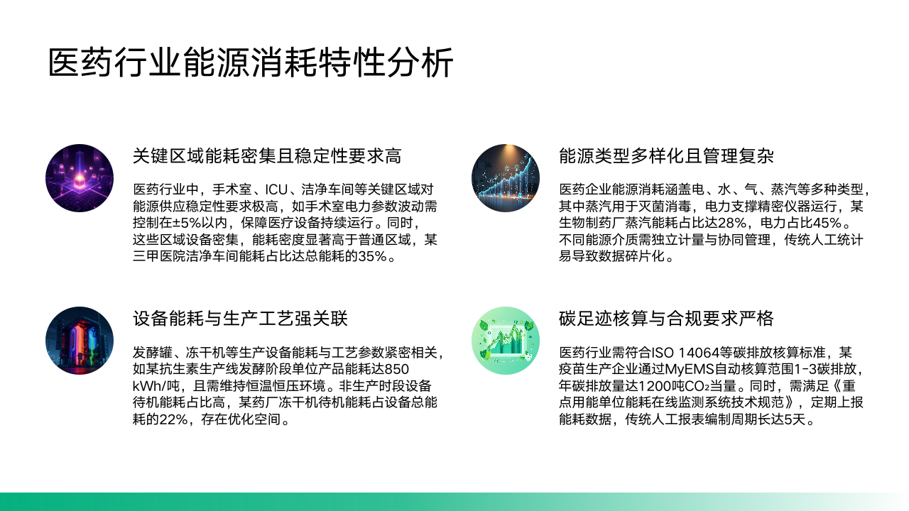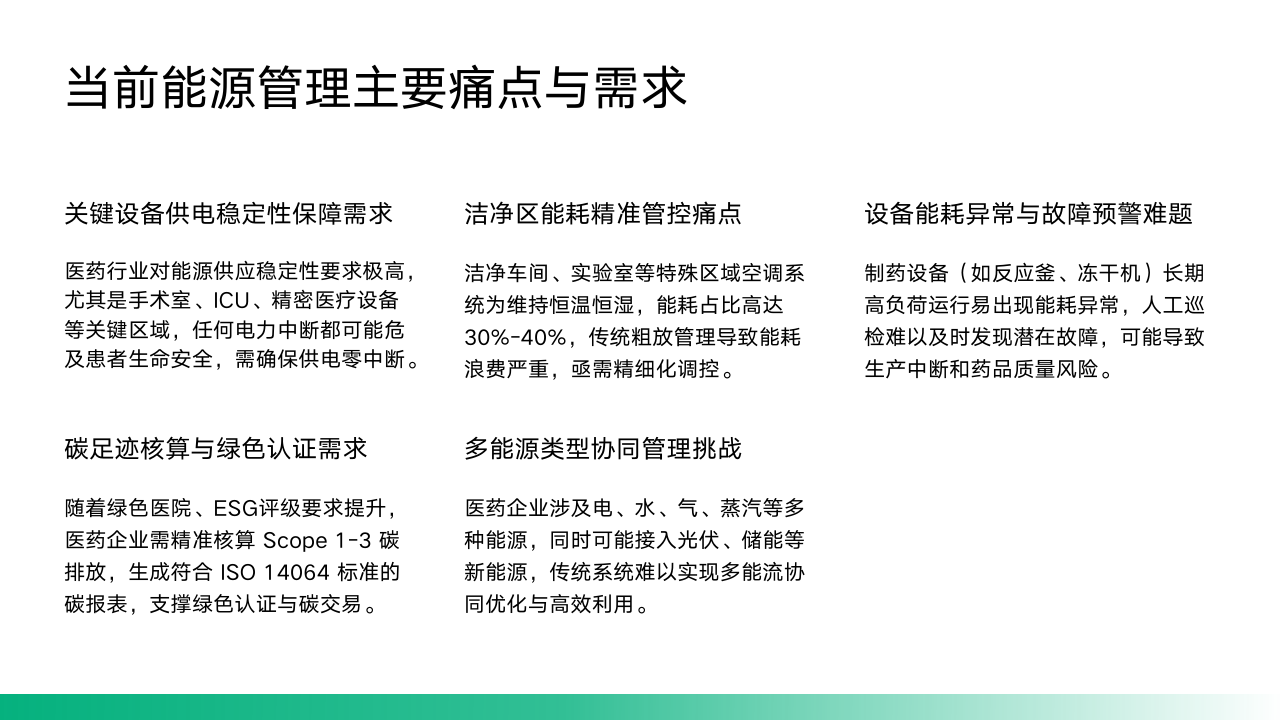 从能源消耗特性来看,医药行业关键区域能耗密集且稳定性要求高,能源类型多样化且管理复杂,设备能耗与生产工艺强关联,碳足迹核算与合规要求也十分严格。同时,政策驱动下的绿色转型压力不断增大,如国家“双碳”战略的硬性约束、行业能效标准的持续升级等。