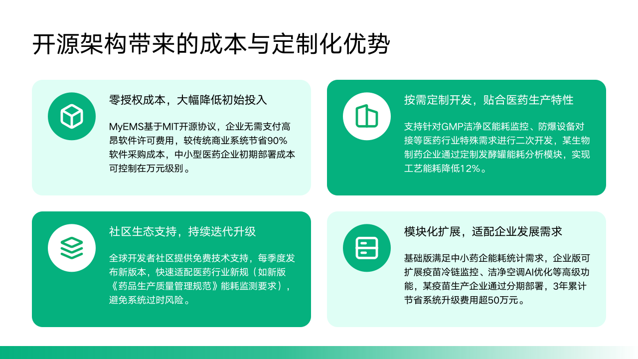 各位同仁,本次演示即将结束,我们一同深入探讨了MyEMS在医药行业能源管理领域的全方位应用与显著价值。从直接节能效益带来的可观成本节省,如某生物制药企业冻干机群年节电18万度、三甲医院ICU洁净区空调系统年节省运行费用80万元等;到间接效益中设备寿命延长、风险降低以及合规管理效率的提升,MyEMS都展现出了卓越的性能。