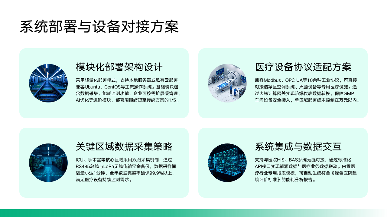 洁净区环境能耗智能调控方面,针对ICU、手术室等洁净区,借助AI算法实时监测环境参数与能耗数据,动态优化空调系统运行策略,在保障洁净度与温湿度要求的同时,实现洁净区能耗降低8%-15%。