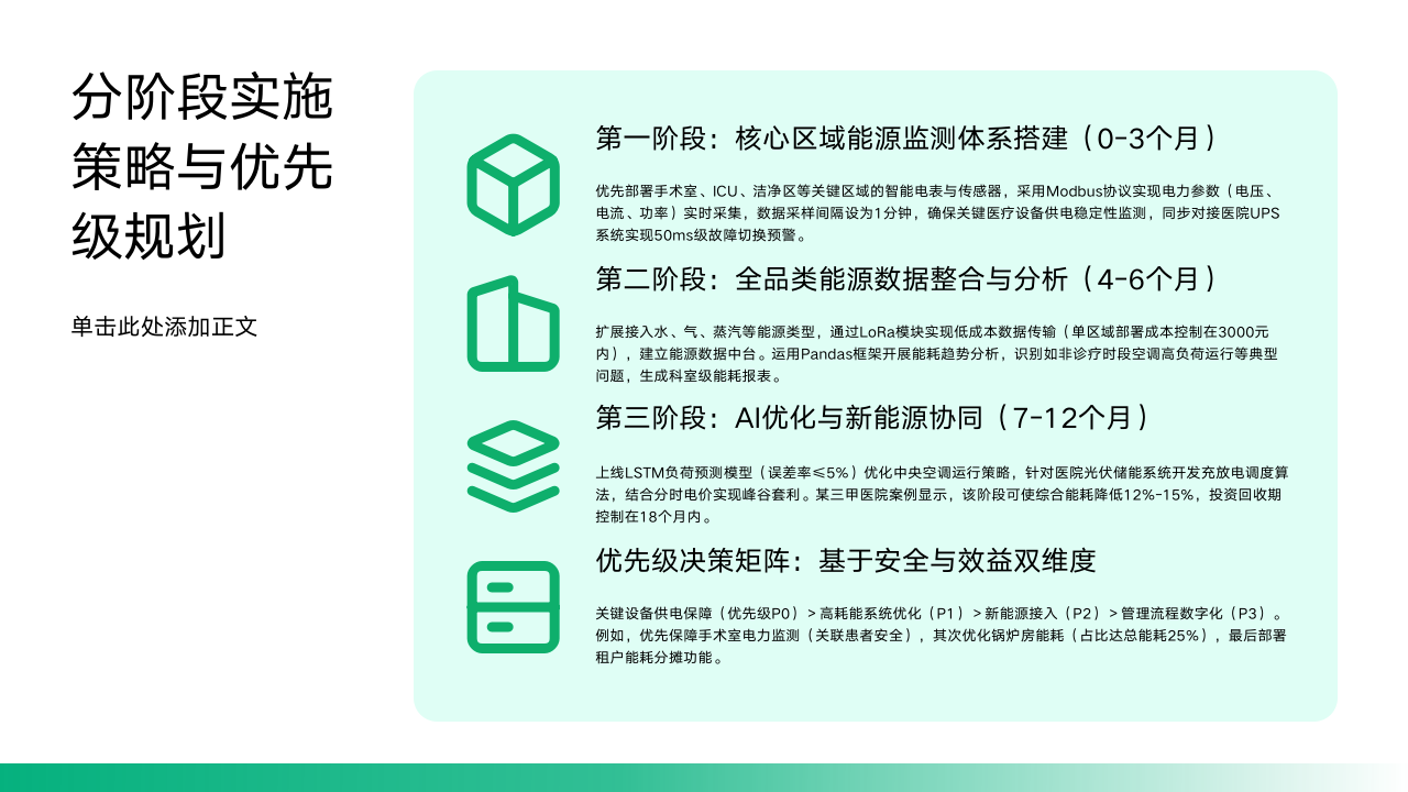 在优先级决策方面,基于安全与效益双维度构建决策矩阵,关键设备供电保障优先级最高,其次是高耗能系统优化、新能源接入,最后是管理流程数字化。例如,优先保障手术室电力监测,其次优化锅炉房能耗,最后部署租户能耗分摊功能。