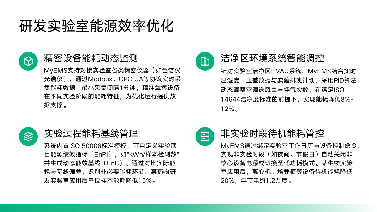 洁净区环境系统智能调控方面,针对实验室洁净区HVAC系统,MyEMS结合实时温湿度、压差数据与实验排班计划,采用PID算法动态调整空调送风量与换气次数。在满足ISO 14644洁净度标准的前提下,实现能耗降低8%-12%,既保障了实验环境的要求,又实现了节能目标。
