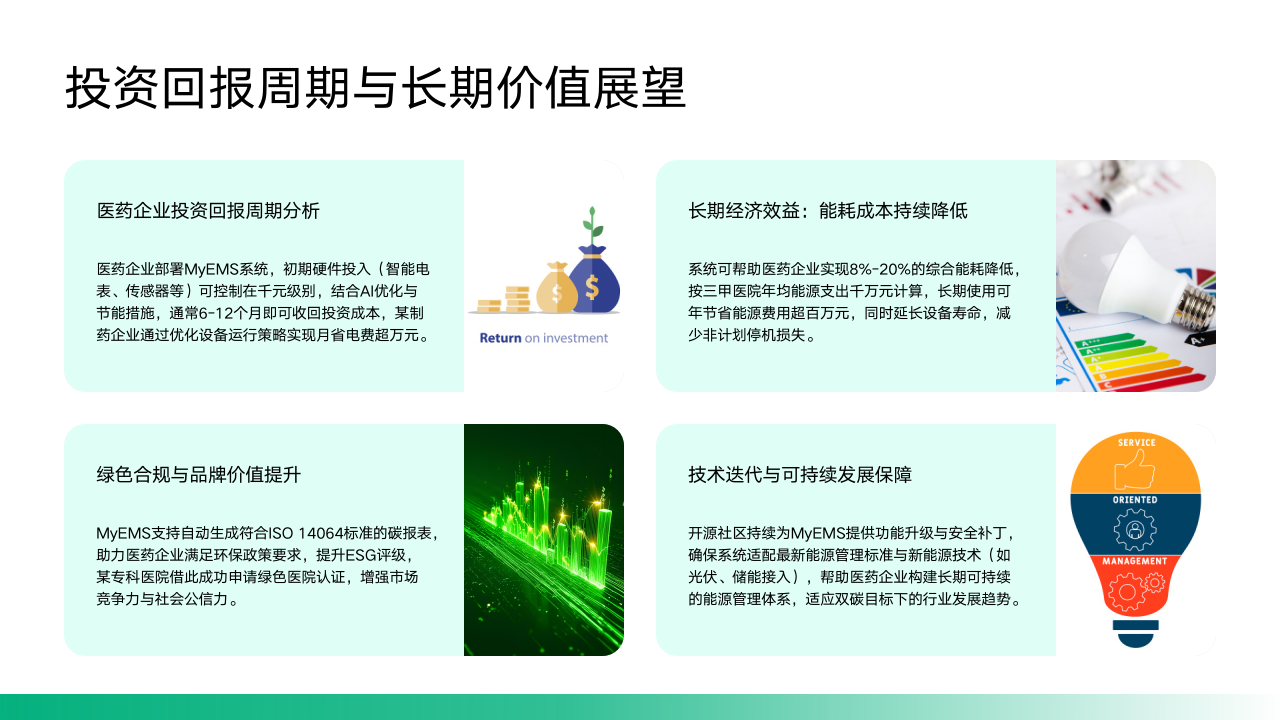 在投资回报方面,医药企业通常6 - 12个月即可收回成本,长期使用还能实现8% - 20%的综合能耗降低,同时提升绿色合规与品牌价值。MyEMS的高阶应用,如AI与数字孪生技术融合、新能源协同优化等,更是为医药行业的能源管理带来了新的变革与发展机遇。