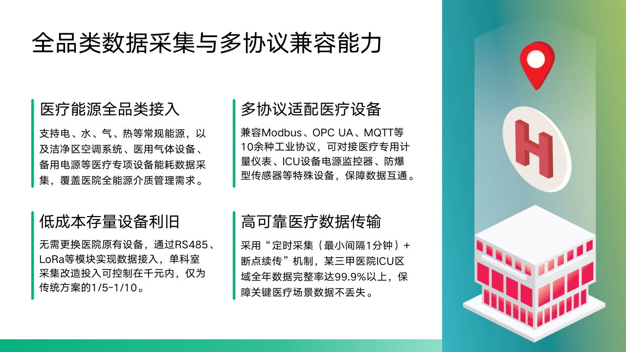 低成本存量设备利旧体现了系统的经济性和实用性。无需更换医院原有设备,通过RS485、LoRa等模块即可实现数据接入,单科室采集改造投入可控制在千元内,仅为传统方案的1/5 - 1/10,大大降低了医院进行能源管理系统升级的成本。