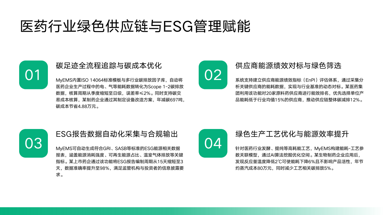 在医药行业绿色供应链与ESG管理赋能上,MyEMS实现了碳足迹追踪、供应商能效对标、ESG报告自动化输出以及绿色生产工艺优化等功能,推动了行业的可持续发展。