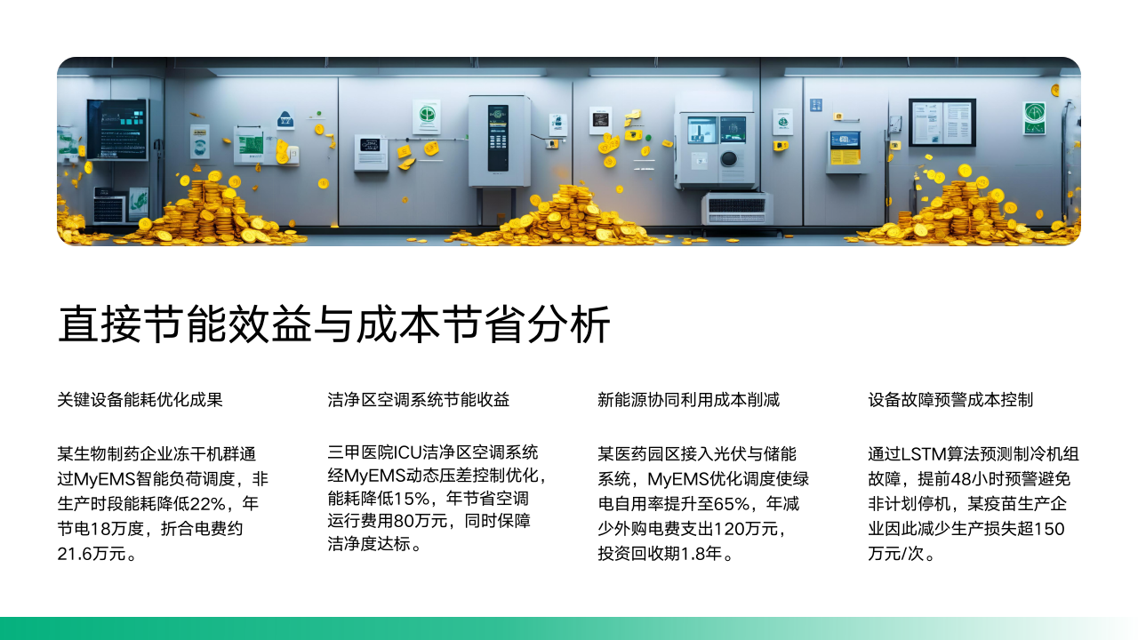 刚刚我们了解了医药行业多个应用案例及成效,看到了MyEMS系统在实际场景中的出色表现。接下来,我们进入“价值评估与投资回报”环节。此部分将深入剖析该系统带来的节能效益、成本节省、间接效益等,让我们清晰知晓投资它能获得怎样的回报。