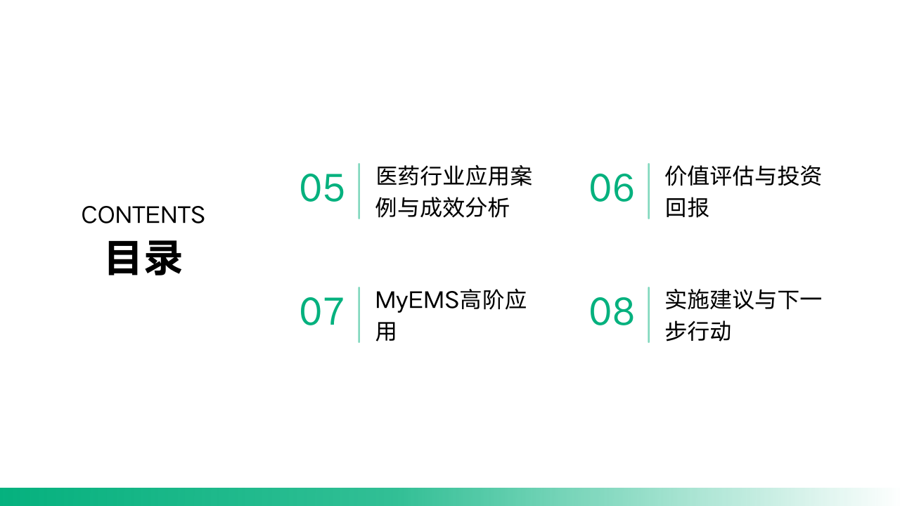 本文下半部分将围绕四方面展开。先进行医药行业应用案例与成效分析,直观展现系统价值;接着开展价值评估与投资回报,明确经济收益;随后介绍MyEMS高阶应用,拓展系统使用边界;最后给出实施建议与下一步行动,助力落地应用。