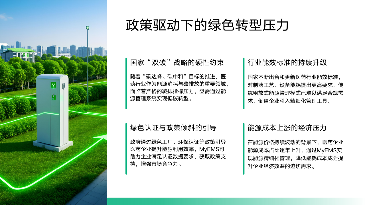 首先是国家“双碳”战略的硬性约束。随着“碳达峰、碳中和”目标的推进,医药行业作为能源消耗与碳排放的重要领域,减排指标压力巨大。这意味着医药企业不能再像以往那样随意排放,必须通过引入能源管理系统,实现低碳转型,以符合国家战略要求。
