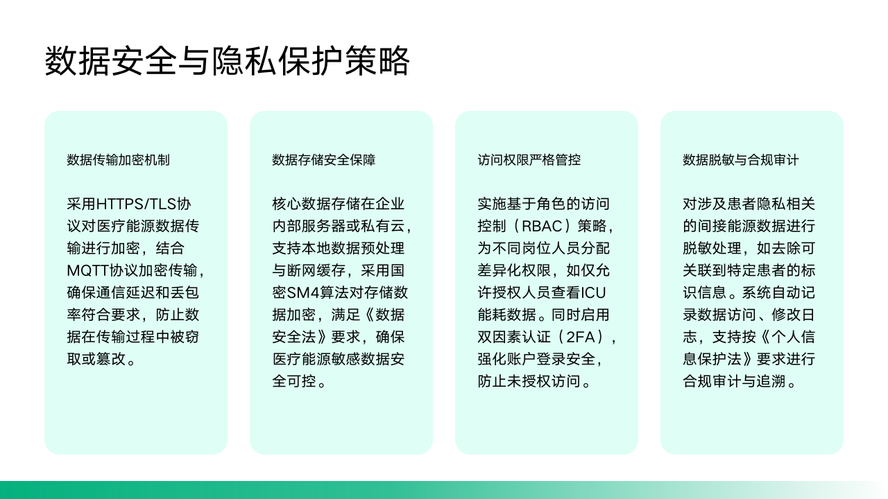 在数据存储方面,核心数据存储于企业内部服务器或私有云,支持本地数据预处理与断网缓存。同时,运用国密SM4算法对存储数据加密,满足《数据安全法》要求,确保医疗能源敏感数据安全可控。