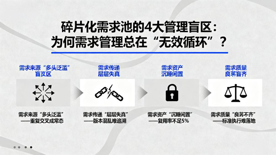 在企业研发与数字化建设过程中,碎片化需求管理易引发多环节效率损耗,具体表现为以下四大盲区,需重点关注并突破: