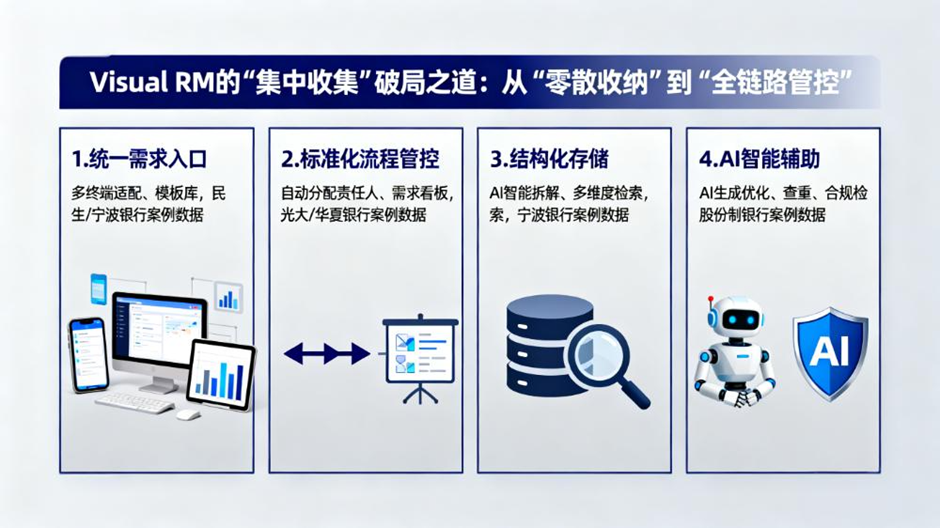 - 解决方案:通过 Visual RM 构建统一需求入口,配置金融行业专属模板,实现需求标准化提交;借助 AI 智能拆解与资产库建设,推动历史需求结构化归档与复用。