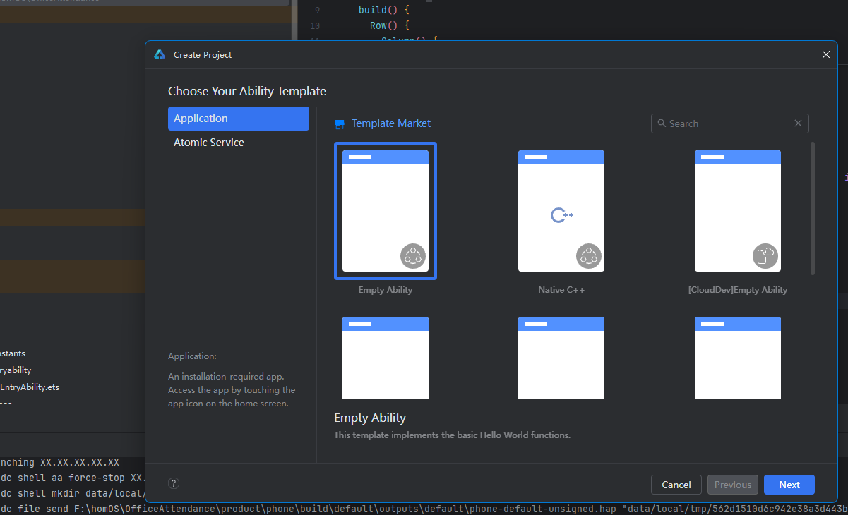 2.选择开发类型与模板:在弹出的界面中,选择「Application」(应用开发,需安装后使用),模板勾选「Empty Ability」(基础 Hello World 模板),点击「Next」。