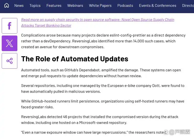 GitHub Dependabot 等工具默认自动创建并合并依赖更新 PR。尽管部分项目启用了“require approvals”,但审查者通常仅关注版本号变更,忽略代码差异。ReversingLabs 发现,包括 Dott(欧洲电动滑板车公司)在内的 46 个仓库在两小时内自动拉取了恶意版本。