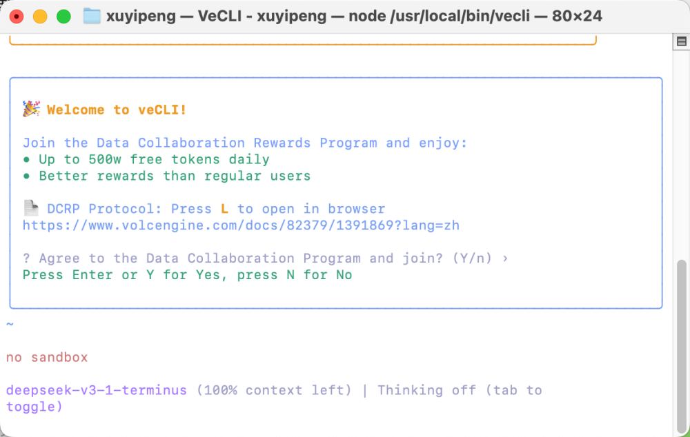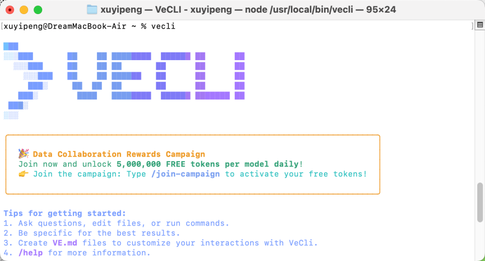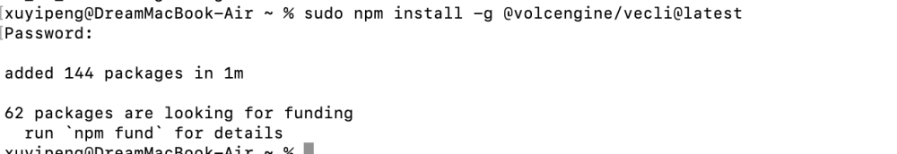 安装方法也是一样的输入命令:sudo npm install -g @volcengine/vecli@latest: