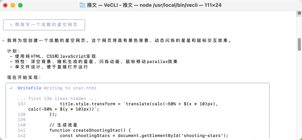 整个生成过程无需多轮对话修正,一次性就达到了可用状态。代码质量高,注释清晰,变量命名规范。在项目文件中打开生成的HTML文件,星空效果流畅运行,视觉效果确实炫酷,完全符合预期。