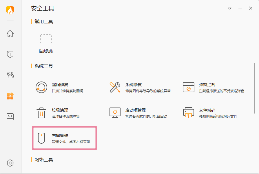 第一步:打开火绒安全软件,进入「安全工具」->「系统工具」,找到「右键菜单管理」。