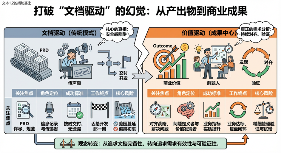 传统的 “文档驱动” 模式最大的陷阱在于,它混淆了手段和目的。它错误地把 “输出了文档(Output)” 等同于 “创造了价值(Outcome)”,导致整个团队都在为一份文档忙碌,而不是为业务结果负责。