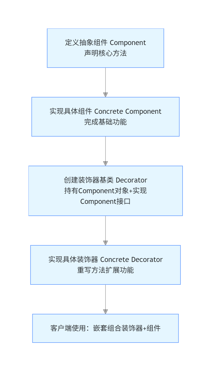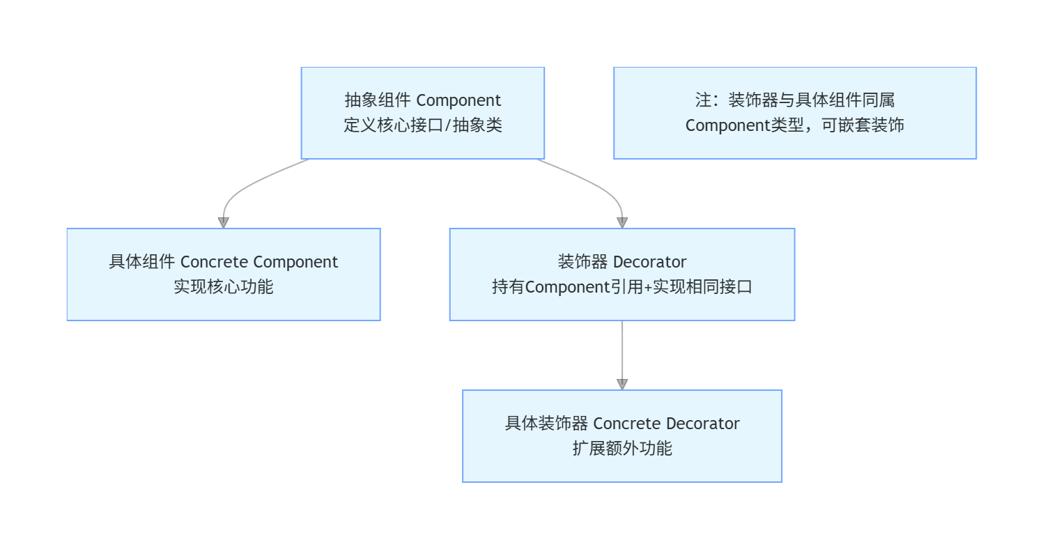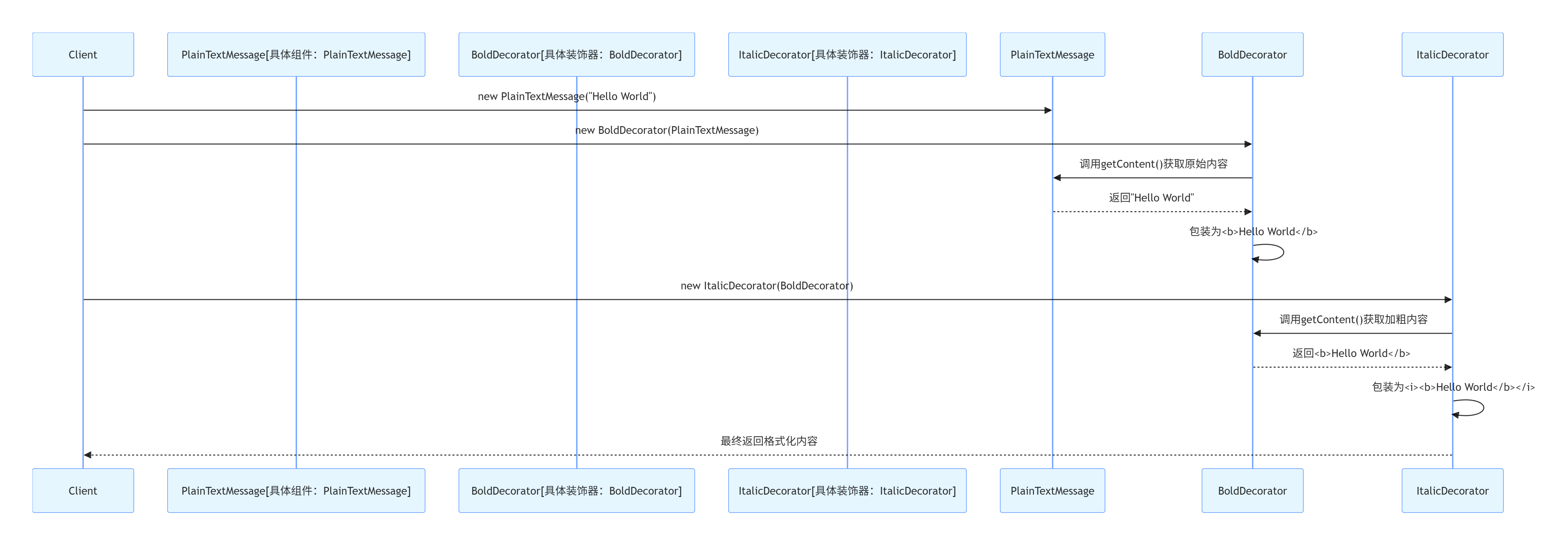 <i><b>Hello, World!</b></i>装饰模式(Decorator Pattern)是一种结构型设计模式,它允许你通过将对象放入包含行为的特殊封装对象中来为原对象绑定新的行为。装饰模式的核心思想是动态地给一个对象添加一些额外的职责,而不是通过继承的方式。这种方式比静态继承更灵活,因为它可以在运行时选择性地添加或删除功能。
