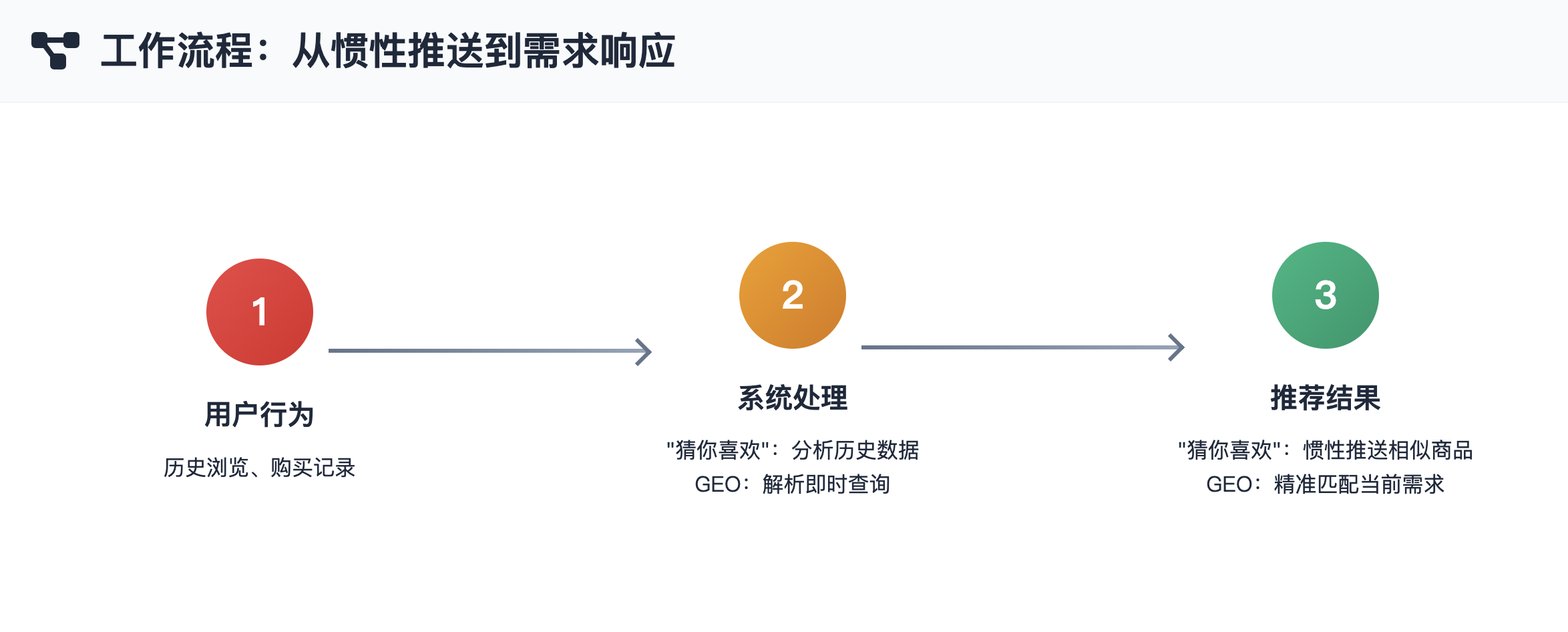 GEO的核心逻辑是“响应”而非“推送”。它关注的是用户当前的即时需求,并通过优化内容的表达方式,确保品牌在AI平台上能够与这些需求高度匹配,从而获得推荐。