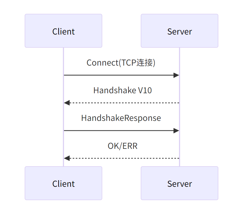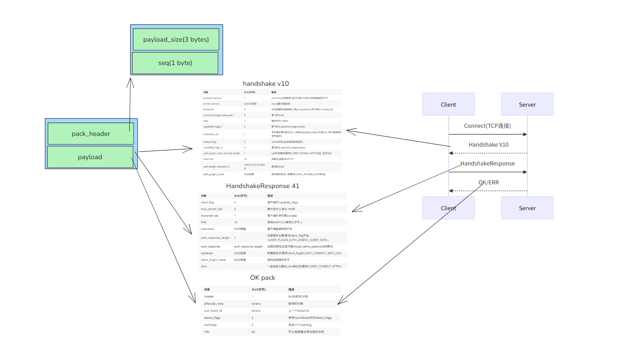 其中包头由3字节的payload_length和1字节的seq组成, 而不同的包, 包体都不一样,但通常第一字节都为包类型.连接过程的包如下: