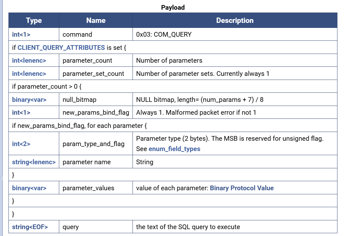 看起来有丢丢复杂, 但只要不考虑CLIENT_QUERY_ATTRIBUTES, 实际上就是0x03+SQL就没了. 主要是复杂在这个CLIENT_QUERY_ATTRIBUTES上, 客户端HandshakeResponse包的前4个字节client_flag中就是记录是否含CLIENT_QUERY_ATTRIBUTES的, 详情如下: