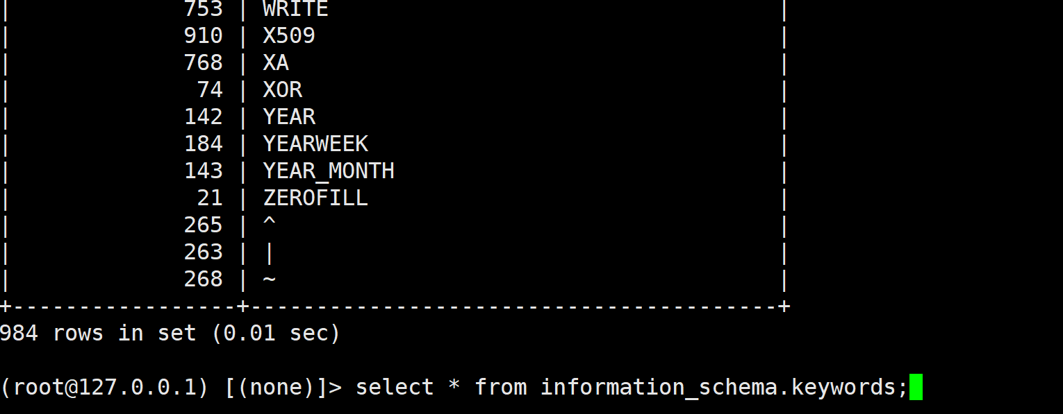information_schema.keywords下的信息应该只有700+, 而我们查询出来的有900+, 说明确实是重写成功了.