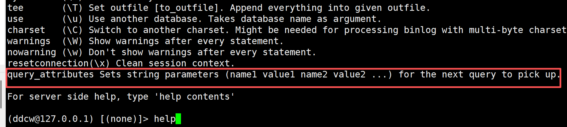 我们在mysql客户端中使用help即可看到query_attributes