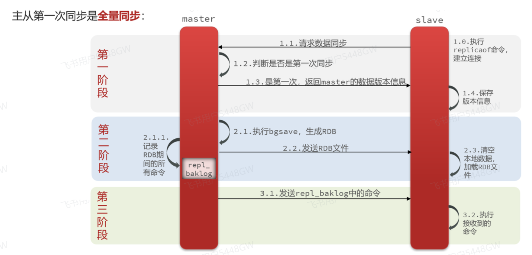 整个复制过程可以分为三个阶段:连接建立阶段、数据同步阶段、命令传播阶段。