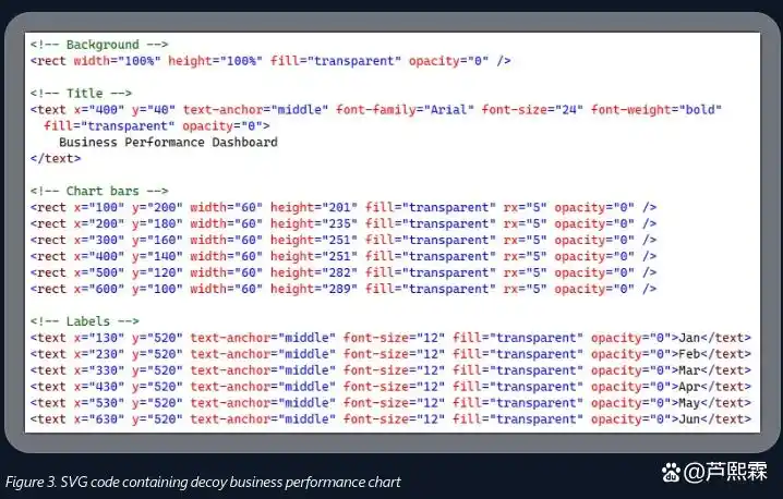 所有图形元素均设置opacity="0"和透明填充,确保用户打开时无任何视觉输出,但保留完整的DOM结构。这种“视觉无害化”设计可有效绕过基于渲染行为的沙箱检测。