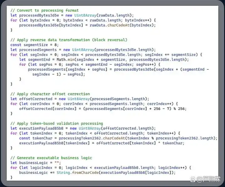 此机制的关键在于:整个载荷不含任何可疑字符串(如eval、unescape、atob)或加密片段,所有操作均通过合法JavaScript语法完成,且变量名(如processBusinessMetricsf43e08)具有高度语义性,进一步增强迷惑性。