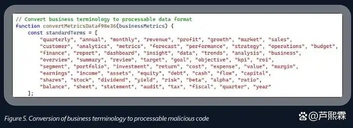 与以往依赖Base64编码、字符串拼接或控制流扁平化的混淆技术不同,此次攻击的核心在于“语义合法化”——即利用自然语言生成能力,使恶意脚本在表层结构上呈现出业务逻辑合理性,从而欺骗人工审查与初级自动化分析工具。攻击者将JavaScript功能隐藏于不可见的SVG元素中,并通过映射“revenue”、“operations”、“risk”等词汇序列动态重构恶意指令,形成一种新型的非加密型混淆范式。此类手法不仅提升了载荷的抗逆向能力,也对现有邮件安全网关、终端防护系统及用户判断力构成严峻挑战。