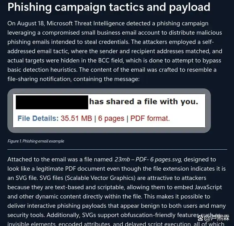 近年来,随着大型语言模型(Large Language Models, LLMs)在代码生成、文本创作等领域的广泛应用,其双刃剑特性在网络安全领域日益凸显。一方面,安全厂商利用AI提升威胁检测、自动化响应与情报分析能力;另一方面,攻击者亦开始借助LLM增强攻击载荷的隐蔽性、适配性与规避能力。2025年9月,微软威胁情报团队披露了一起新型钓鱼活动,首次明确将攻击载荷的混淆手法归因于LLM辅助生成。该活动以SVG(Scalable Vector Graphics)文件为载体,通过嵌入大量看似合法的“商业术语”构建语义伪装层,成功绕过传统基于签名或加密特征的静态检测机制。