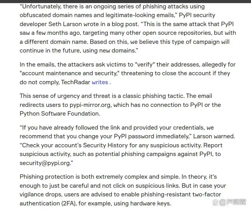 邮件正文通常避免直接索要密码,而是引导用户“登录以确认身份”,利用开发者对平台流程的熟悉感降低戒心。部分变种甚至模拟PyPI的两步验证界面,在用户输入密码后,再要求输入“一次性验证码”,实则收集完整凭证。