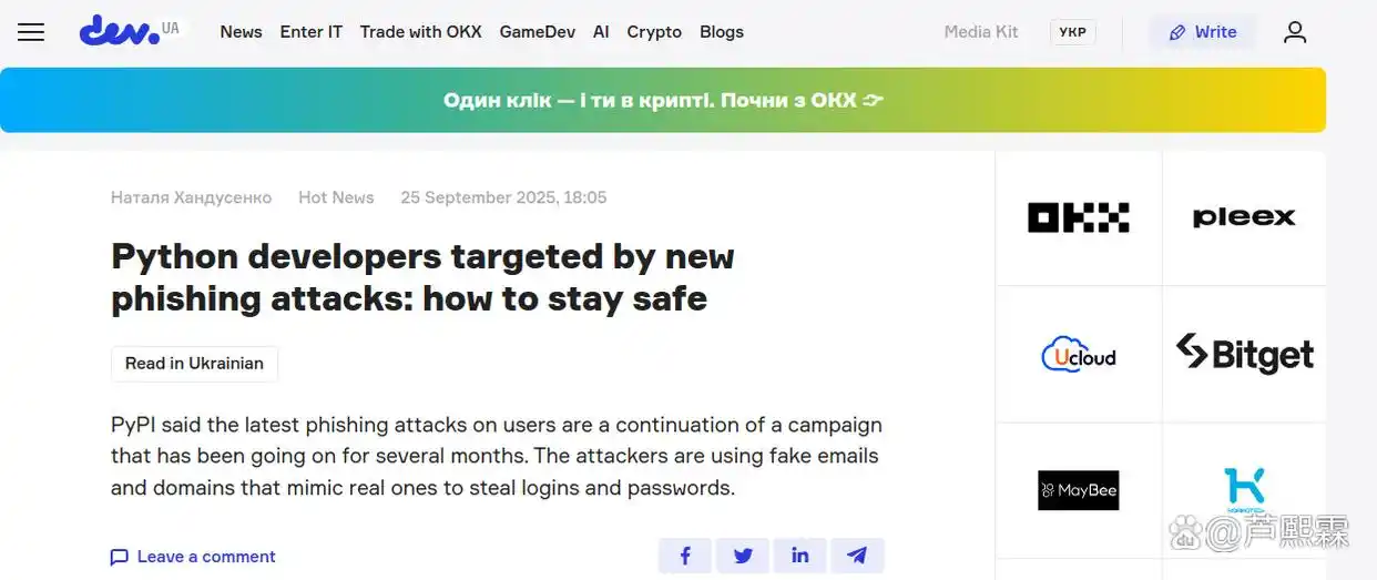 开源软件已成为现代软件开发的基石,而其分发枢纽——如Python包索引(PyPI)——自然成为攻击者高价值目标。与传统终端用户钓鱼不同,针对开发者的攻击不仅意图窃取身份凭证,更旨在渗透软件构建与分发流程,实现大规模、隐蔽的供应链投毒。2025年,PyPI安全团队联合乌克兰媒体dev.ua披露了一起持续数月的定向钓鱼活动:攻击者通过仿冒官方域名发送“账户验证”邮件,威胁若未在限定时间内点击链接完成操作,账户将被永久封禁。此类邮件外观高度逼真,包含PyPI品牌元素、SSL证书标识及本地化语言,极具迷惑性。