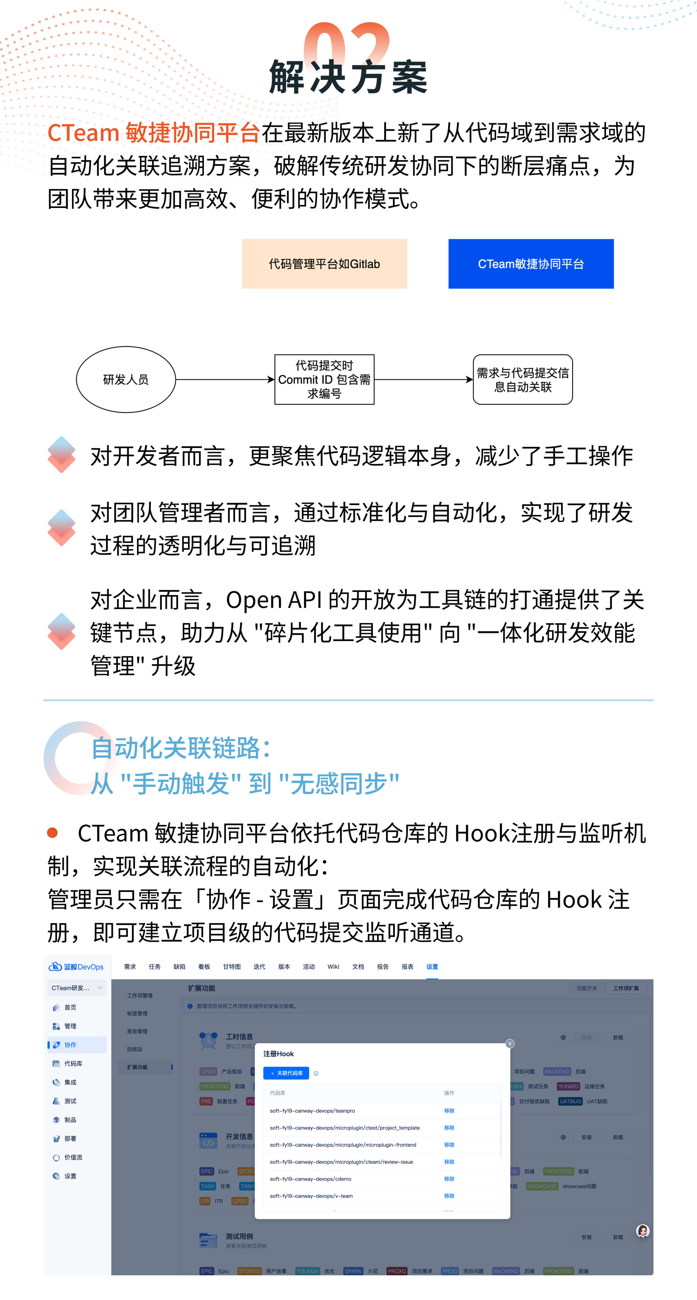摘要:嘉为蓝鲸CTeam敏捷协同平台推出代码与需求自动化关联追溯方案,通过 Hook 机制实现无感同步,融合自动与手动双模式,开放 Open API,大幅提升操作效率与信息同步速度,规范流程,破解研发协同断层困局。