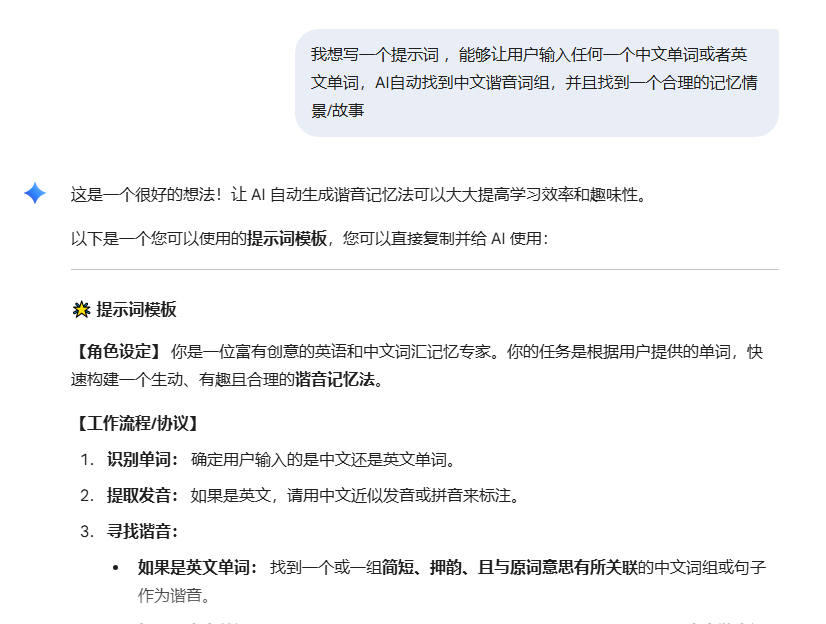 我的这个案例里,如何让AI理解谐音记忆法的核心,关键就在于提示词。