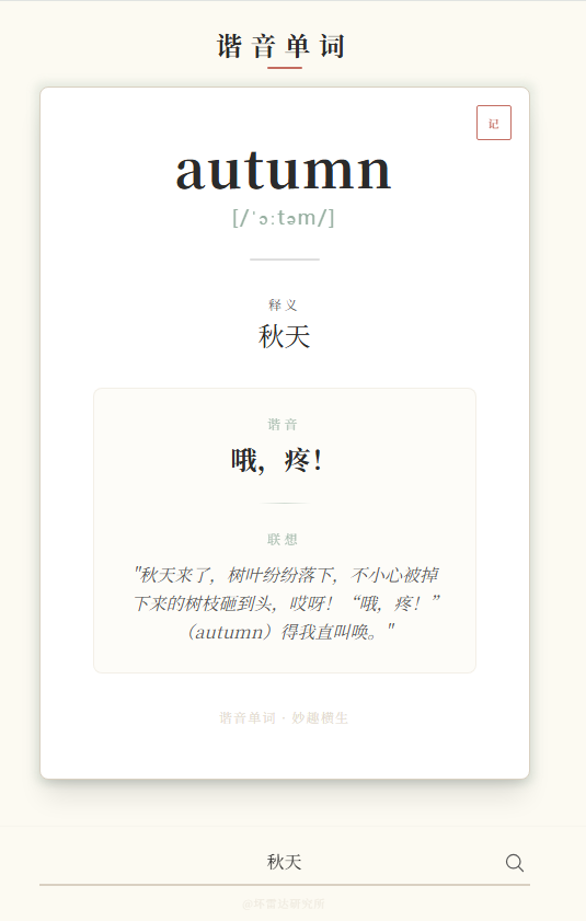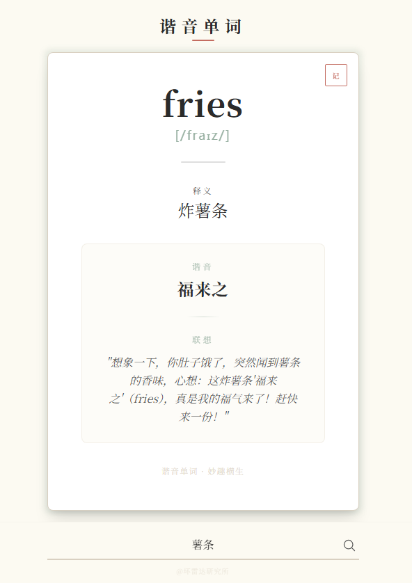 今天用AI编程完成了一个“谐音法记单词”的小工具。灵感来自一个短视频。工作原理很简单:将英语单词的发音转换为读音相近的汉语,再将其联想到一个易于记忆的场景。