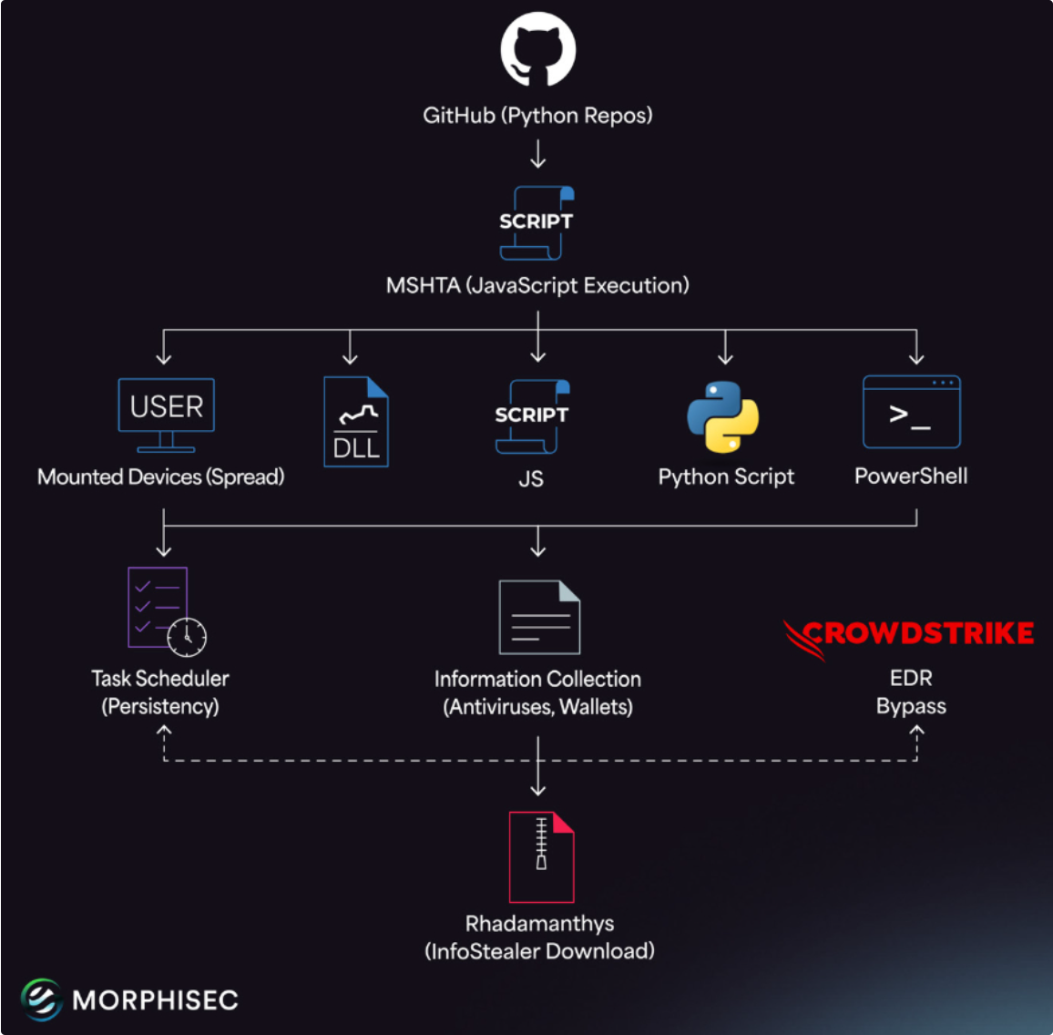 攻击链涉及通过嵌入 GitHub 存储库中的 Python 或 JavaScript 加载器存根分发恶意软件,这些存储库伪装成 OSINT 工具、DeFi 机器人、GPT 包装器和安全主题实用程序,旨在吸引分析师和开发人员。