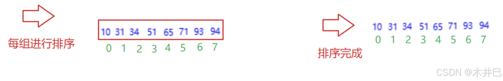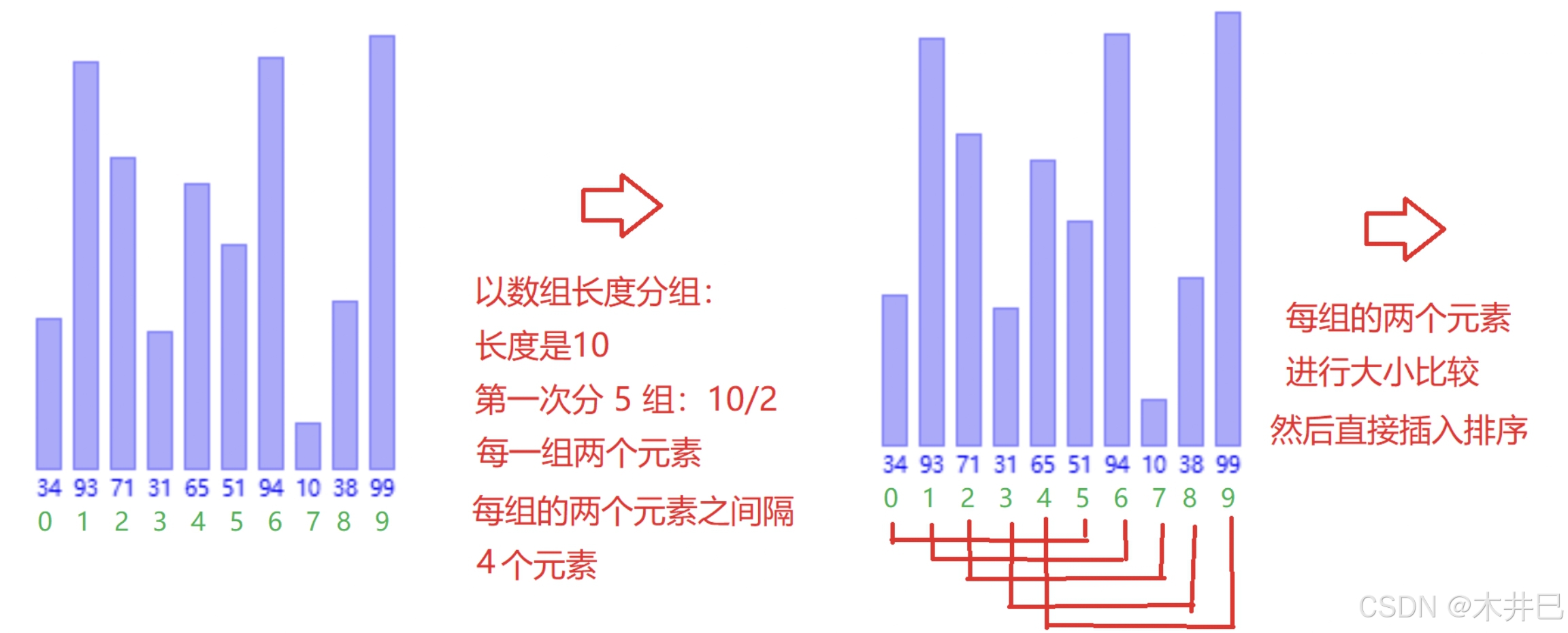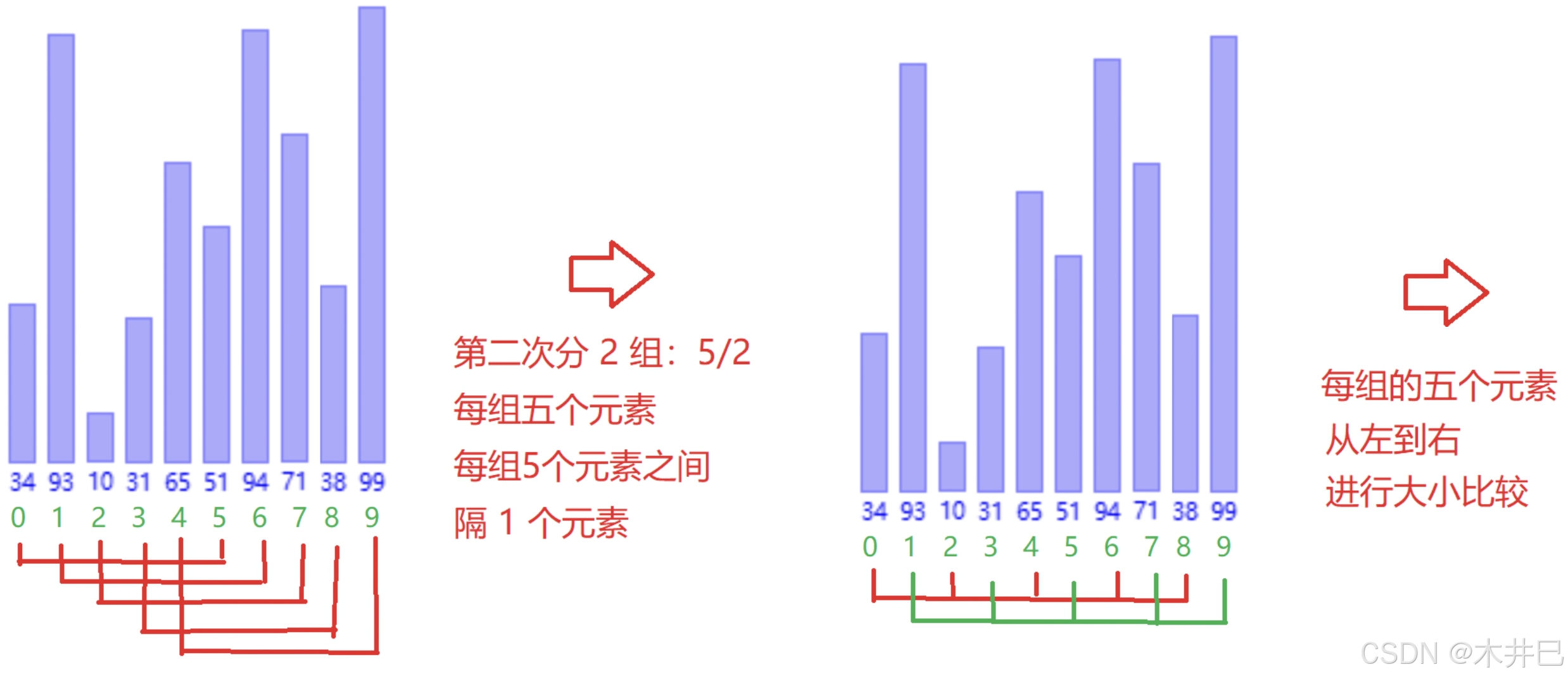 希尔排序采用跳跃式分组(按照gap进行分组),好处是能够把大的数据放到更靠后的位置,随着分的组数越来越少,数据逐渐趋于有序