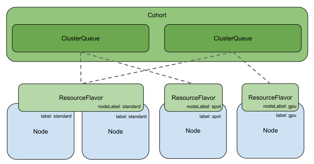 kueue将worker节点上的资源抽象成由特定资源风味(ResourceFlavor)表征的资源池, 框定了某一类含有特定资源类型/规格的节点。