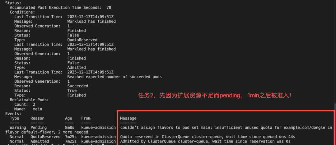 再立刻启动同样配置的第二个任务,受localqueue中nominalQuota: 10的约束,任务2会pending,等待任务1执行完,释放了example.com/dongle资源,最后进入runing状态跑完任务。